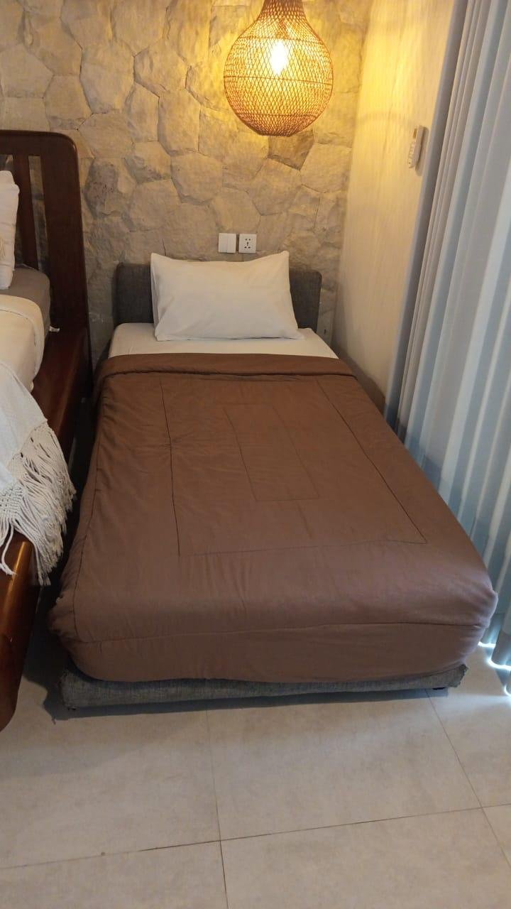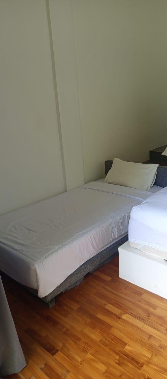 Our Extrabed has two types, folding bed and proper bed. The size of our proper bed is 100 x 200cm (single-size), it includes fitted sheet, pillow, pillow case, and blanket.